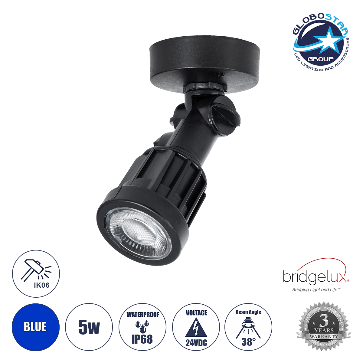 GARDENINI 61548 Επιφανειακό Φωτιστικό Σποτ Κήπου LED 5W 550lm 38° DC 24V IP68 Υψηλής Αντοχής ABS IK06 Φ7 x Υ14.5cm - Μπλε 450nm Dimmable - Μαύρο - Bridgelux Chip - 3 Years Warranty