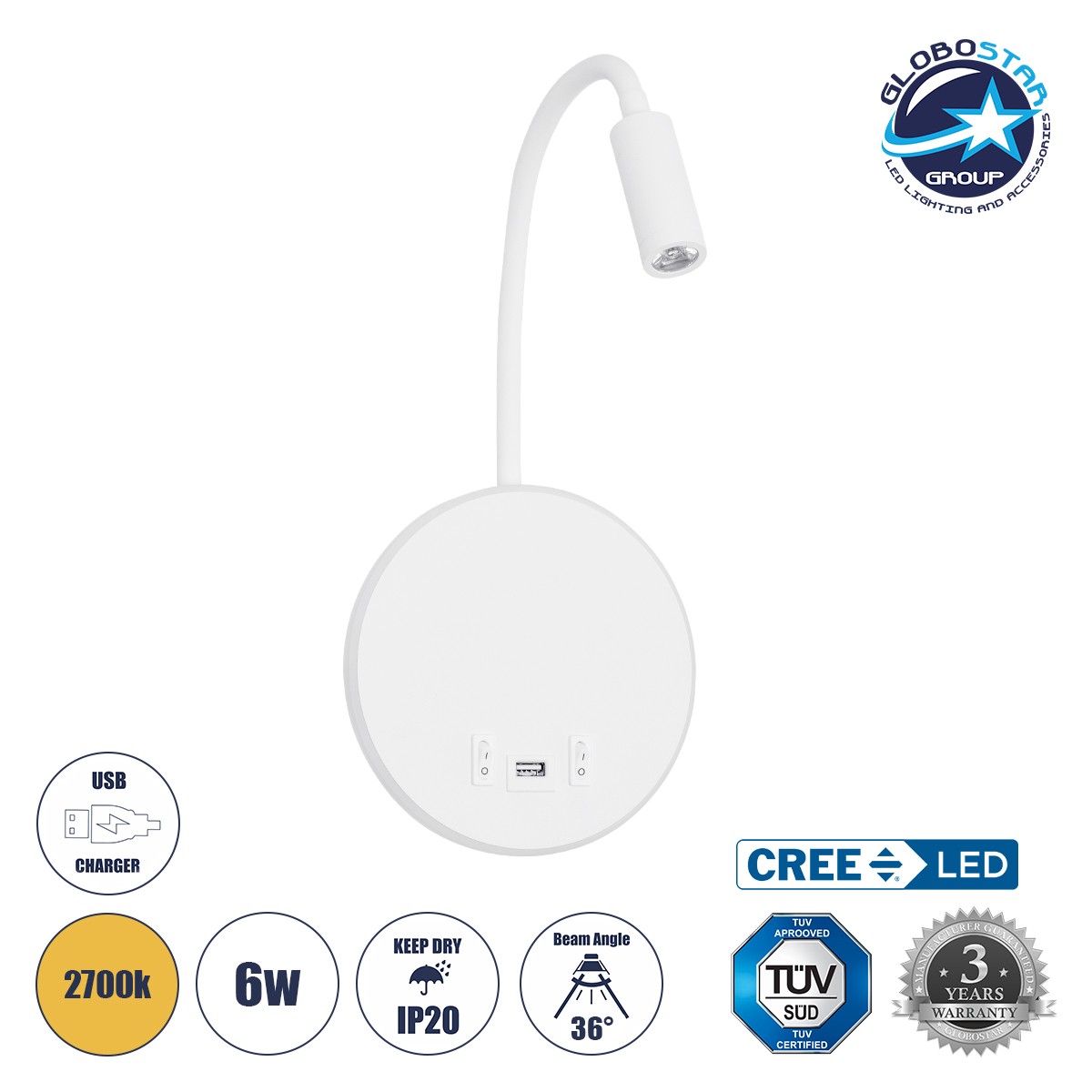 GOOSE 61693 Μοντέρνο Φωτιστικό Τοίχου - Απλίκα Ξενοδοχείου Reading Light με Φορτιστή USB 3A LED 6W 600lm 36° & 360° AC 220-240V IP20 Θερμό Λευκό 2700K - Bridgelux COB Chip & TÜV SÜD Driver - Λευκό Ματ - Μ15.5 x Π22.5 x Υ30cm - 3 Χρόνια Εγγύηση