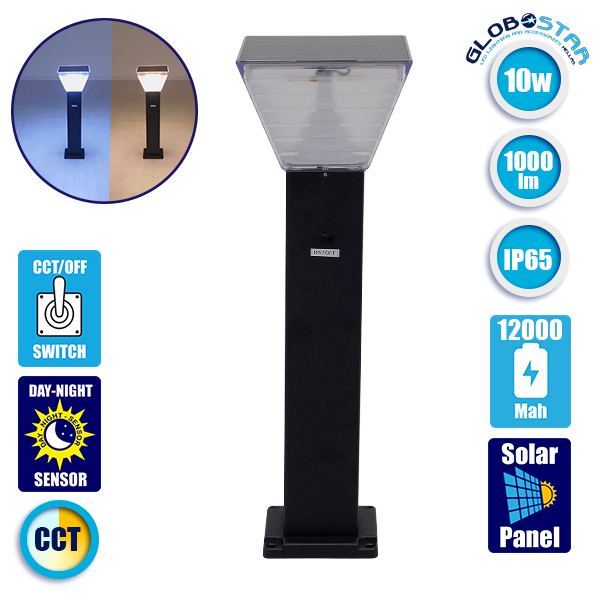 Αυτόνομο Αδιάβροχο IP65 Ηλιακό Φωτοβολταϊκό Φωτιστικό Κολωνάκι Κήπου CCT 20x20x60cm LED 10W με Αισθητήρα Νυχτός Ψυχρό Λευκό 6000k & Θερμό Λευκό 3000k 12122