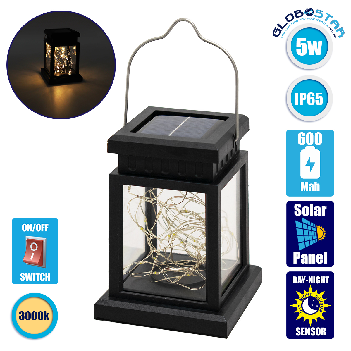 71505 Αυτόνομο Ηλιακό Κρεμαστό Διακοσμητικό Φωτιστικό Φανάρι LED 5W 300 lm με Ενσωματωμένη Μπαταρία 600mAh - Φωτοβολταϊκό Πάνελ με Αισθητήρα Ημέρας-Νύχτας IP65 Θερμό Λευκό 3000k