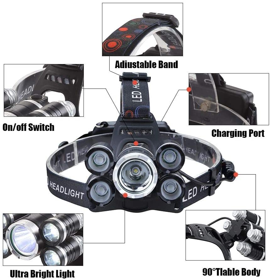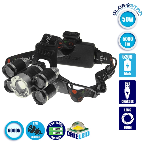 79059 Φακός Κεφαλής Επαναφορτιζόμενος LED CREE XML2-T6 Chip 50 Watt 5000 lm με 2 x 18650 Μπαταρίες 5200Mah Ψυχρό Λευκό 6000 K