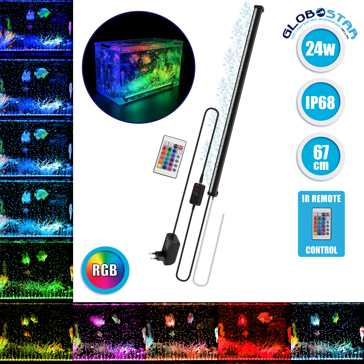 79677 Φωτιστικό Ενυδρείου & Οξυγονωτής / Μηχανισμός Φυσαλίδων 67cm LED 24W 180° AC 230V Αδιάβροχο IP68 με Ασύρματο Χειριστήριο IR Πολύχρωμο RGB