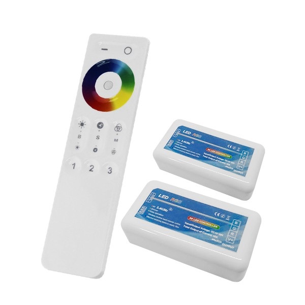 Το Σετ Ασύρματο RF 2.4G LED Controller Αφής RGB 12-24 Volt για Δυο Groups GloboStar 04142 συμπεριλαμβάνει ένα τηλεχειριστήριο για τον απομακρυσμένο έλεγχο, μια επιτοίχια θήκη για το τηλεχειριστήριο, και δυο δέκτες με μέγιστο φορτίο 144 watt στα 12 volt και 288 watt στα 24 volt.