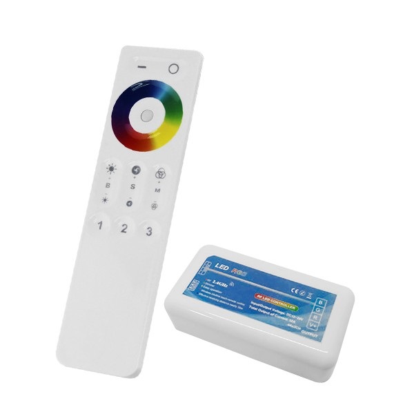 Το Σετ Ασύρματο RF 2.4G LED Controller Αφής RGB 12-24 Volt για Ένα Group GloboStar 04042 συμπεριλαμβάνει ένα τηλεχειριστήριο για τον απομακρυσμένο έλεγχο, μια επιτοίχια θήκη για το τηλεχειριστήριο, και ένα δέκτη με μέγιστο φορτίο 144 watt στα 12 volt και 288 watt στα 24 volt.