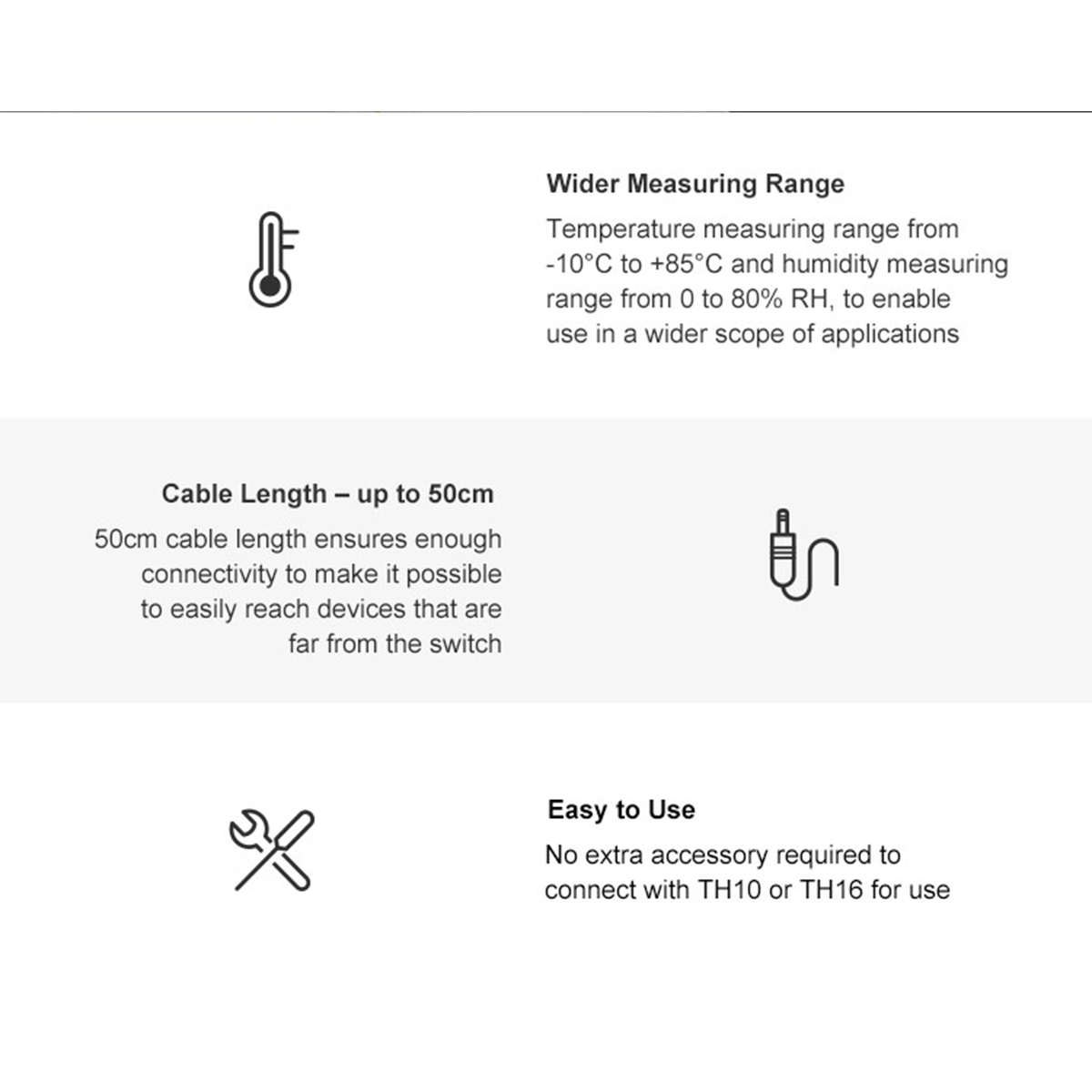 Extra Informations - Επιπλέον Πληροφορίες : Wider Measuring Range: Temperature measuring range from -10°C to +85°C and humidity measuring range from 0 to 80% RH, to enable use in a wider scope of applications Cable Length – up to 50cm: 50cm cable length ensures enough connectivity to make it possible to easily reach devices that are far from the switch Easy to Use: No extra accessory required to connect with TH10 or TH16 for use