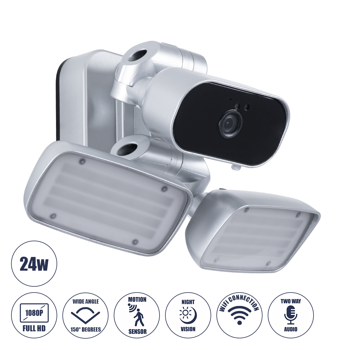 86043 Προβολέας LED SMD 24W 2160lm με IP Camera 1080P 2MP WiFi 150° Μοιρών - AC 230V - με Αισθητήρα Ημέρας-Νύχτας & Ρύθμιση Χρόνου Ανάμματος - Αδιάβροχος IP66 Ψυχρό Λευκό 6000K - Ασημί