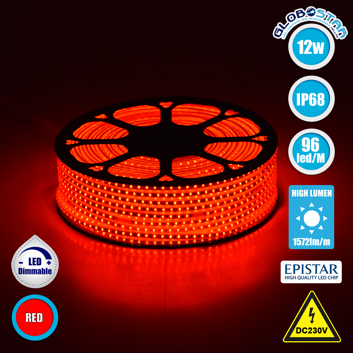 70504 Slim Ταινία Μονής Σειράς Epistar LED SMD 2835 1m 12W/m 96LED/m 1572lm/m 120° DC 230V Αδιάβροχη IP68 Κόκκινο Dimmable