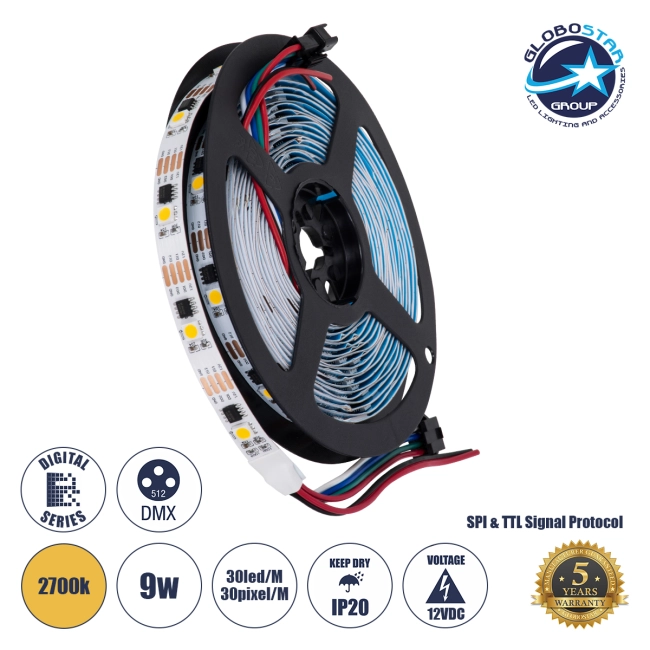DIGIPRO 90598 Ψηφιακή Pixel Addressable Ταινία LED 9W/m 810lm/m 120° DC 12V IP20 30 x SMD5050 Chip/m 30 x Pixel/m Θερμό Λευκό 2700K Dimmable SPI/TTL Protocol IC TM1908 - Sanan SMD Chip - Μ500 x Π1 x Υ0.2cm - Ρολό 5 Μέτρων - 5 Χρόνια Εγγύηση